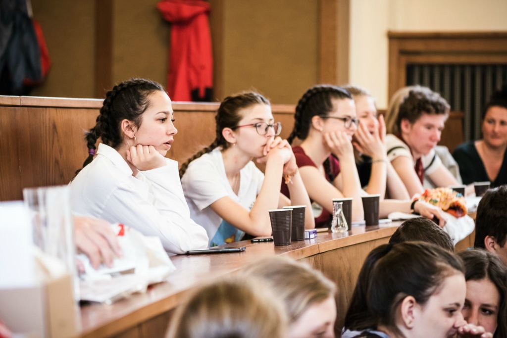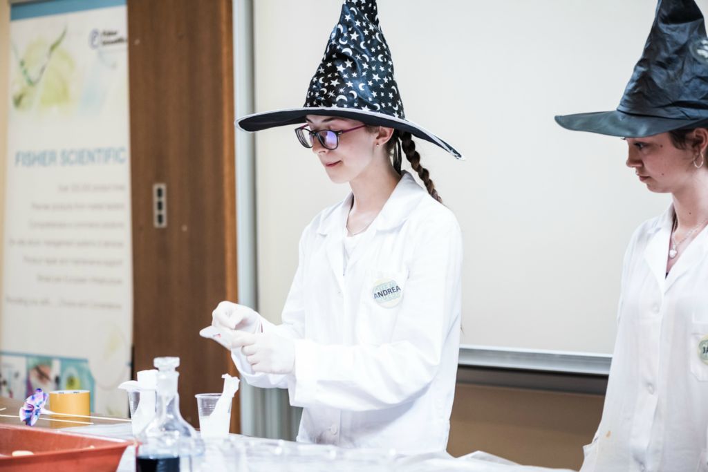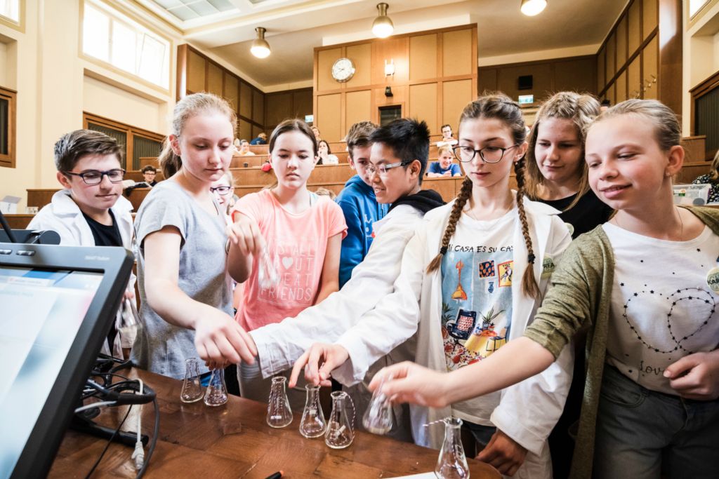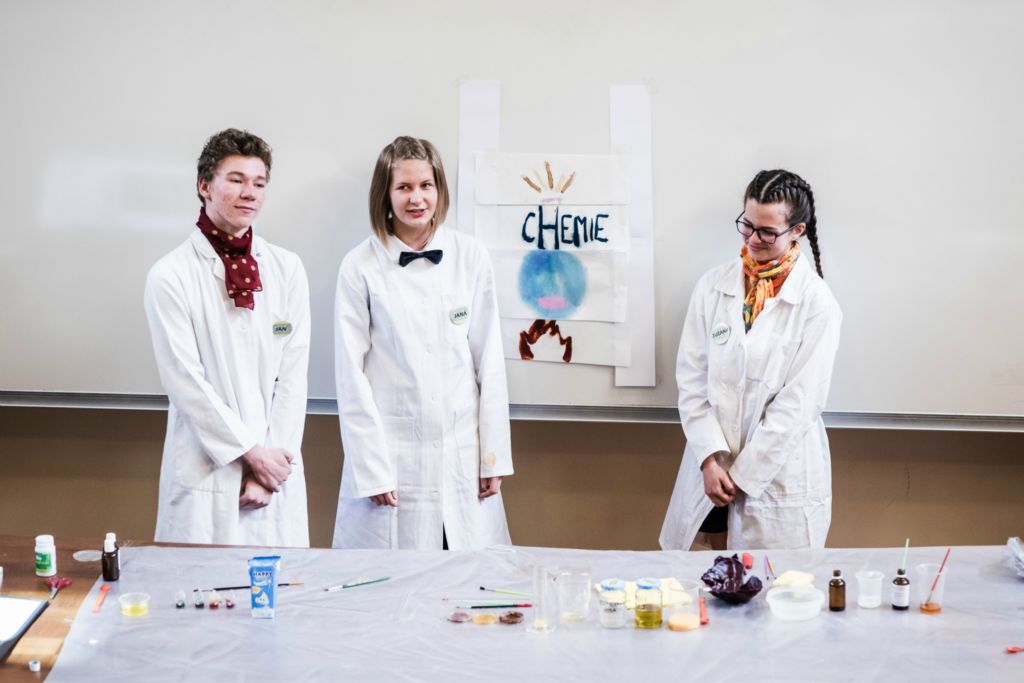 V devět hodin byla soutěž zahájena losováním pořadí týmů. Oba naše týmy měly štěstí, vylosovaly si pořadové číslo 8 a 10, což byla velká výhoda, protože se mohly poučit z chyb svých soupeřů, jako např. nezapomenout si vzít ochranné pomůcky. Jednotlivé týmy předváděly a vysvětlovaly své pokusy a nervozita našich mladých chemiků rostla, až nastala chvíle, aby se i oni předvedli. Jako první šla děvčata s kouzlením a nutno říct, že to byla od začátku do konce perfektní show, vše se povedlo a celá porota se bavila. I všetečné dotazy zvládly holky s přehledem. Po kouzlení nastoupili naši malíři, představení svých pokusů měli ve verších a velice se porotě líbili. Nezapomněli jediný rým a všechny experimenty se jim podařily.
