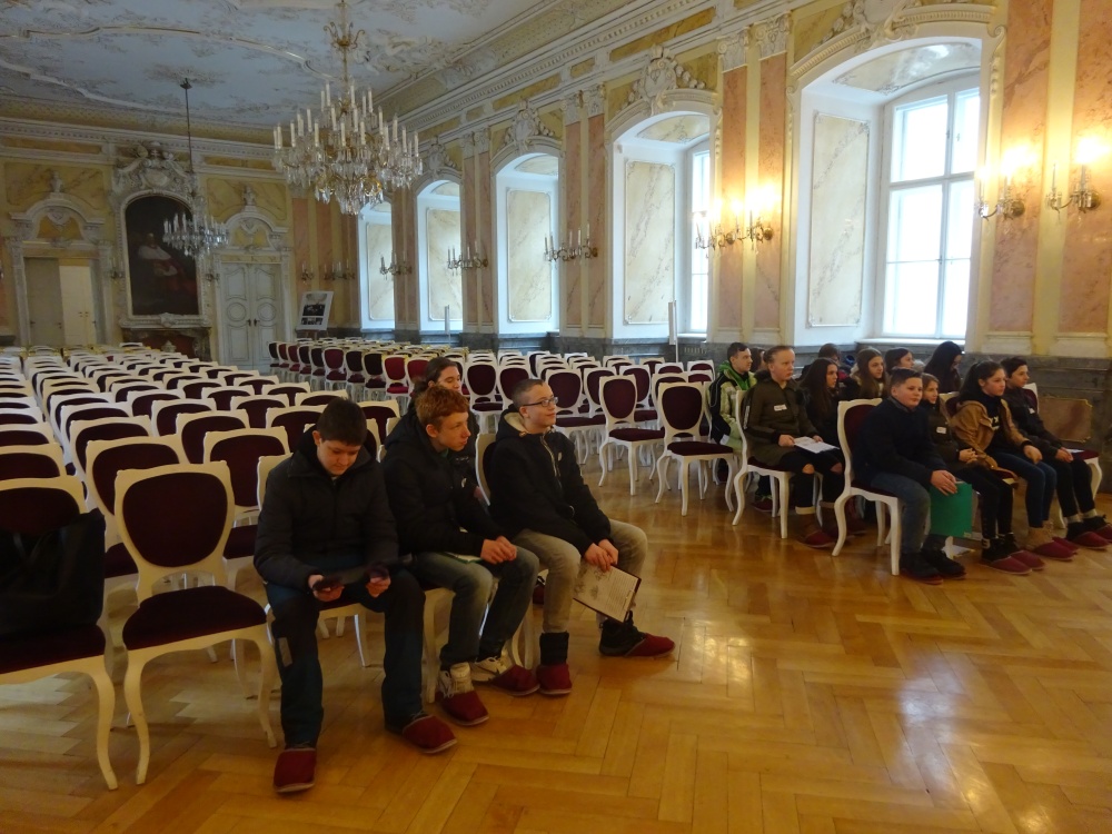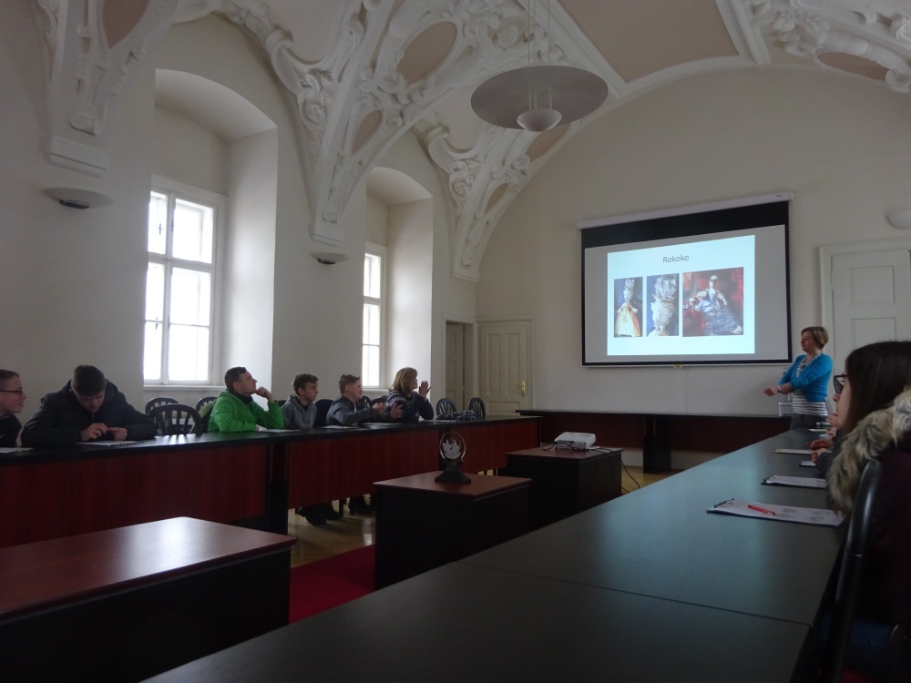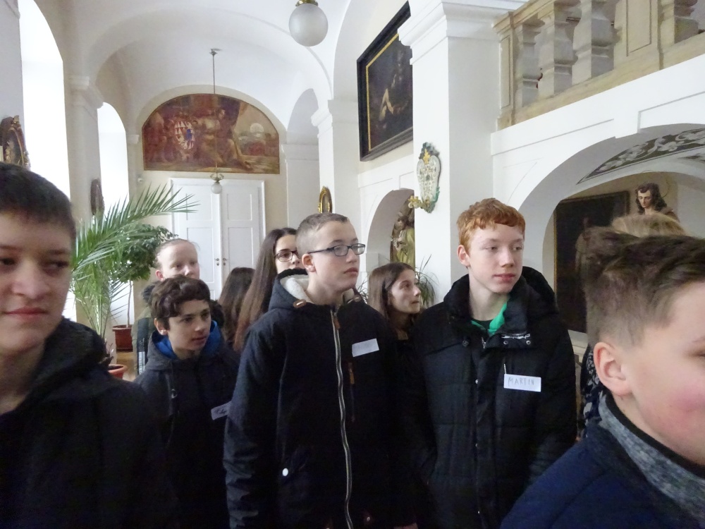Naše kroky tentokrát vedly do Arcibiskupského paláce v Olomouci, tedy do míst, která jsou spjata s významnými osobnostmi naší historie. A protože jsme nedávno v dějepisu probírali dobu osvícenství, vybrala jsem pro své osmáky vzdělávací program o  císařovně Marii Terezii a jejich dětech. Nejdříve jsme si vyslechli všeobecné informace o paláci a pak už jsme začali plnit úkoly a luštili kvíz. Celou dobu nás provázela milá paní Lucie Kropáčková, která svým osobním šarmem zaujala i ty největší neposedy ze třídy, že nikoho nenapadlo rušit výklad nebo práci ostatních.