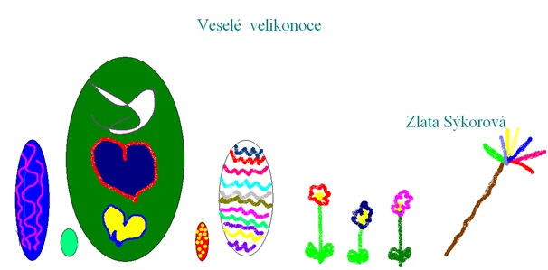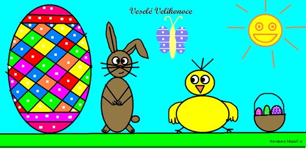 Z mnoha pěkných prací jsme po dlouhém hodnocení vybrali ty, které byly zajímavé a zároveň kvalitně provedené. 4. – 5. ročník obrázky vytvořil v Malování, 6. – 7. ročník ve Wordu, 8. – 9. ročník v Zoner Calistu. Vytištěné velikonoční obrázky jsou vystaveny na nástěnce před učebnou informatiky.