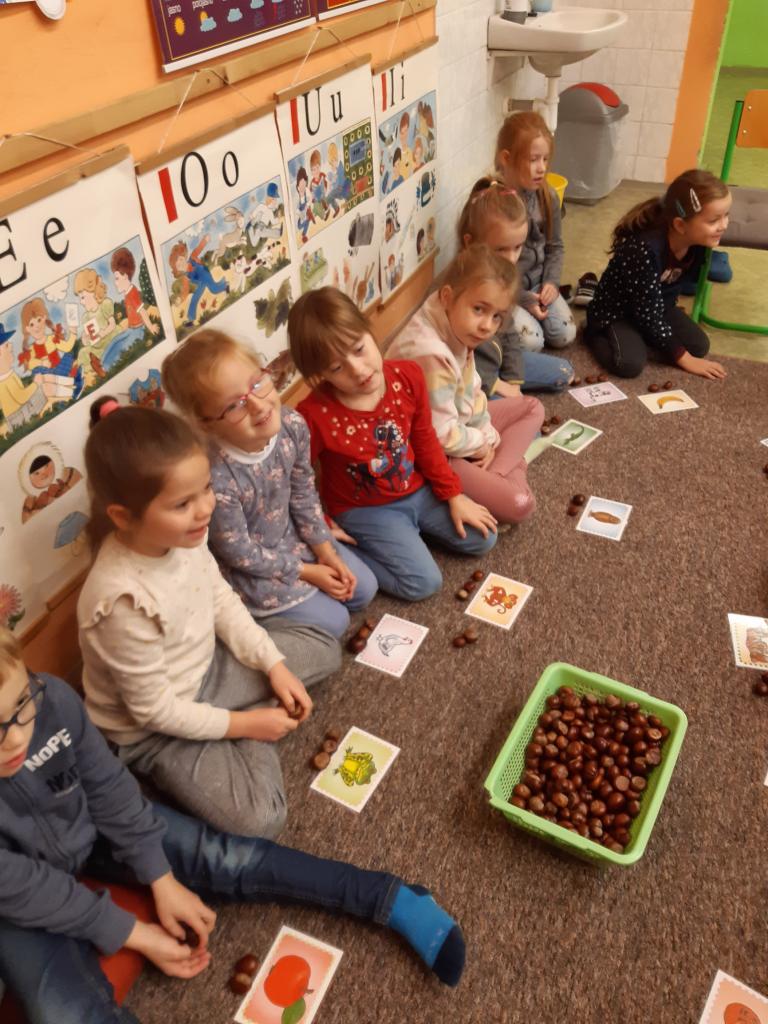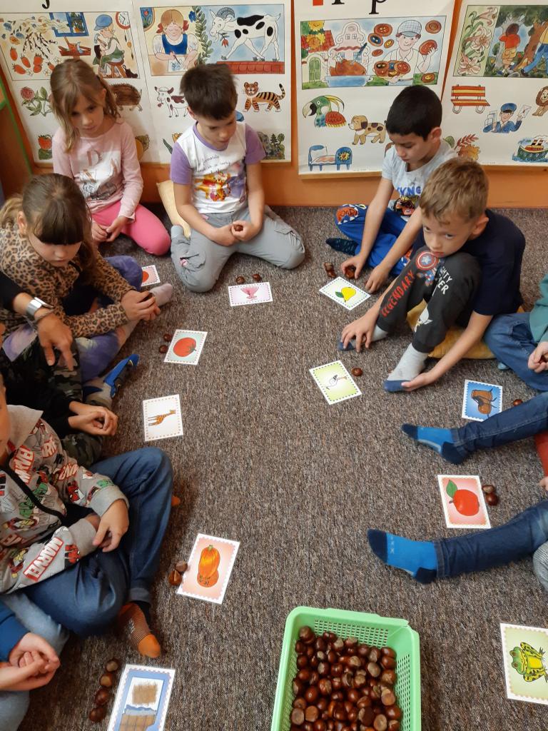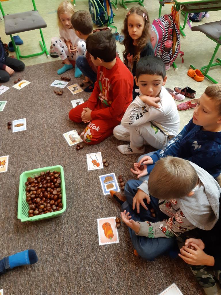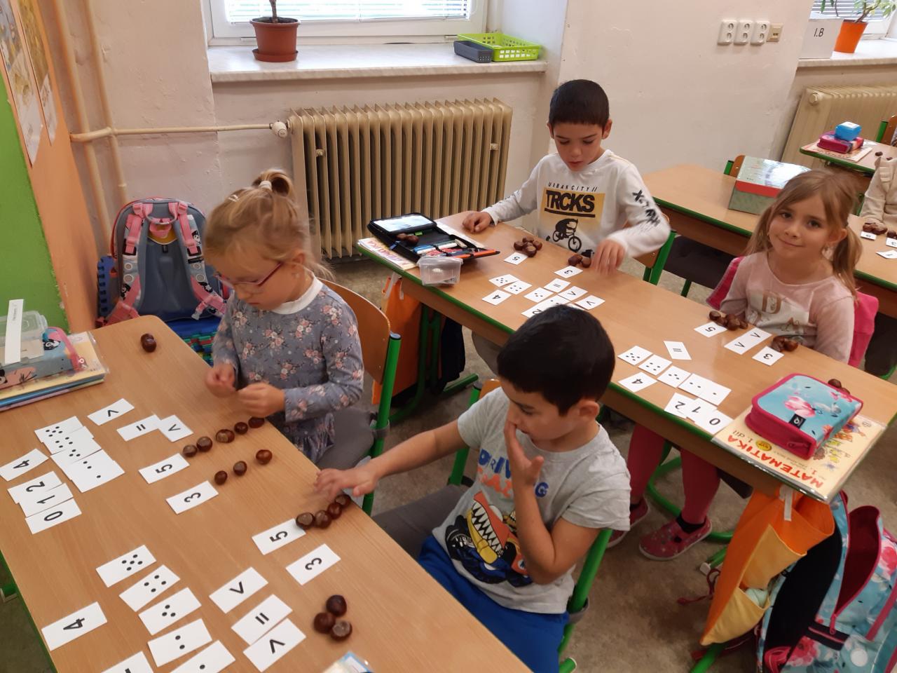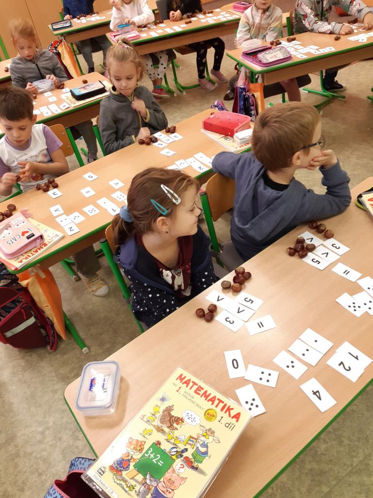 Žáčci z 1. B si minulý týden užili vyučování s kaštánky, které si nasbírali v parku.