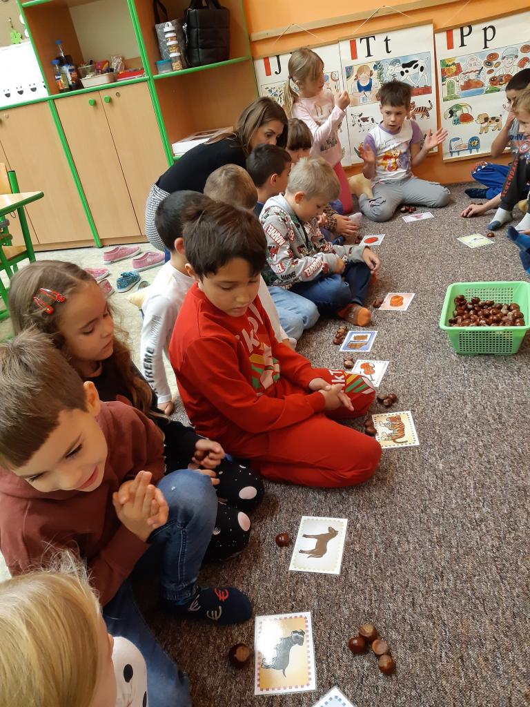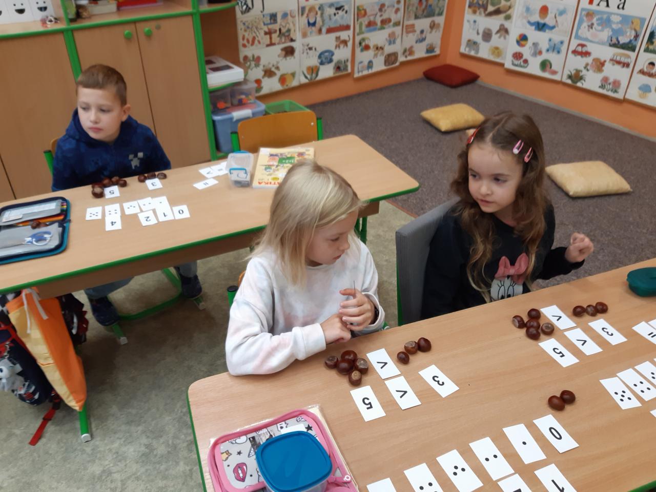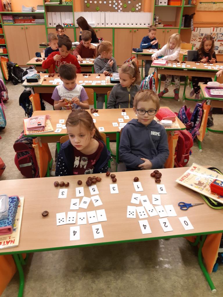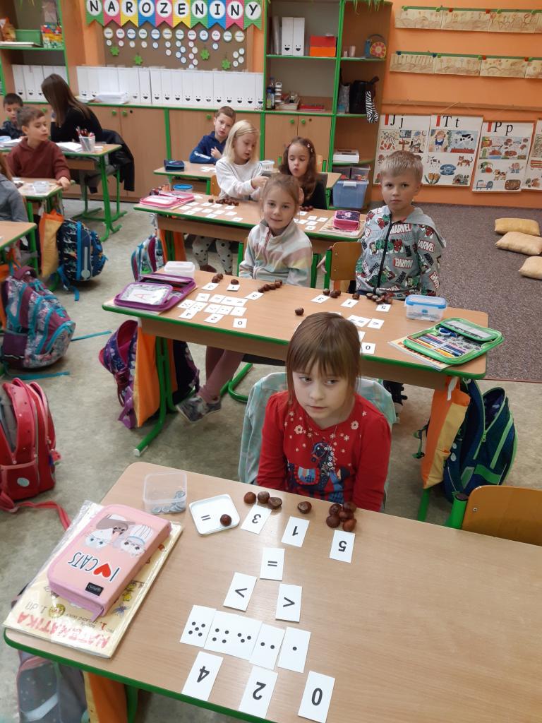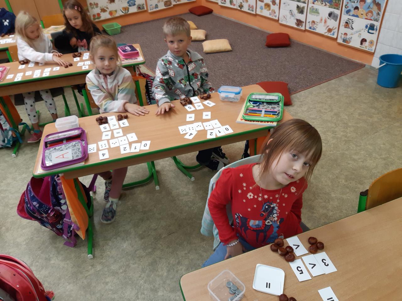 Žáčci z 1. B si minulý týden užili vyučování s kaštánky, které si nasbírali v parku.